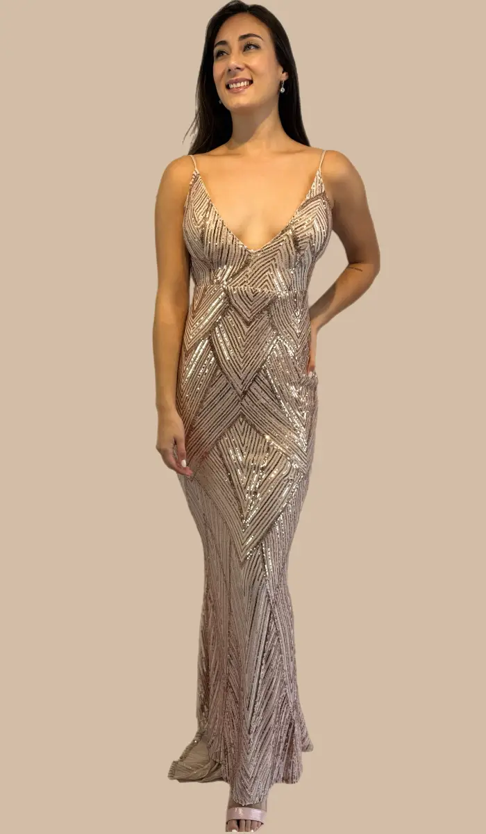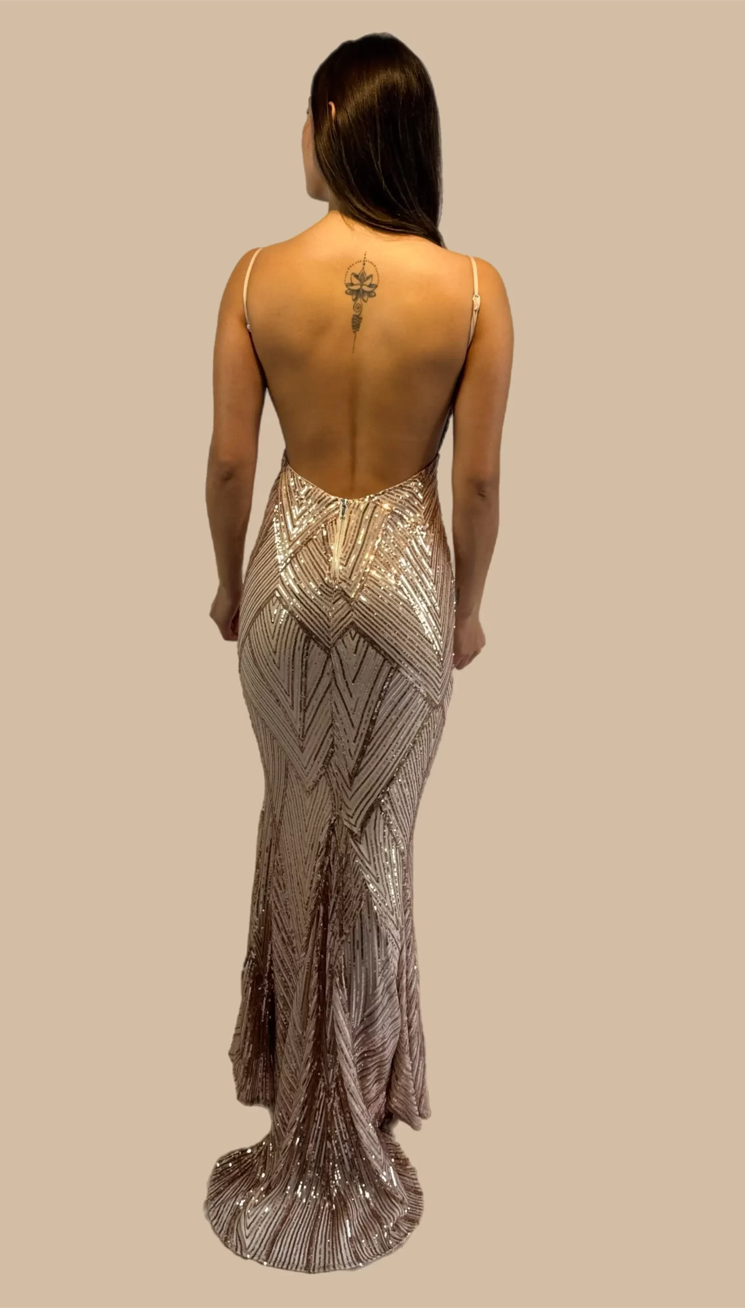 –Vestido formal de sirena con espalda abierta y dobladillo con lentejuelas.
