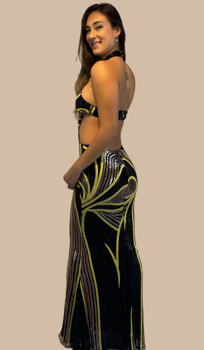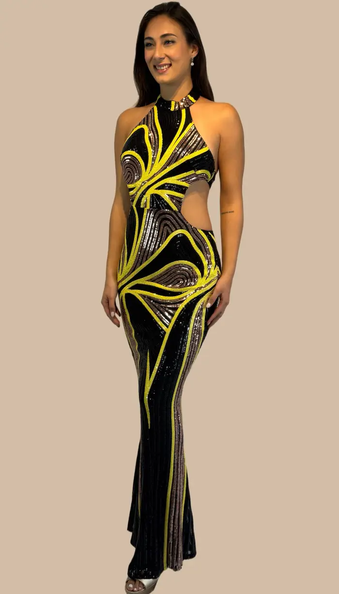 -Vestido negro con detalles amarillos y dorados