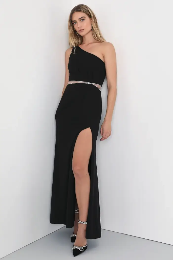-Vestido largo de un solo hombro con diamantes de imitación en negro Glittering