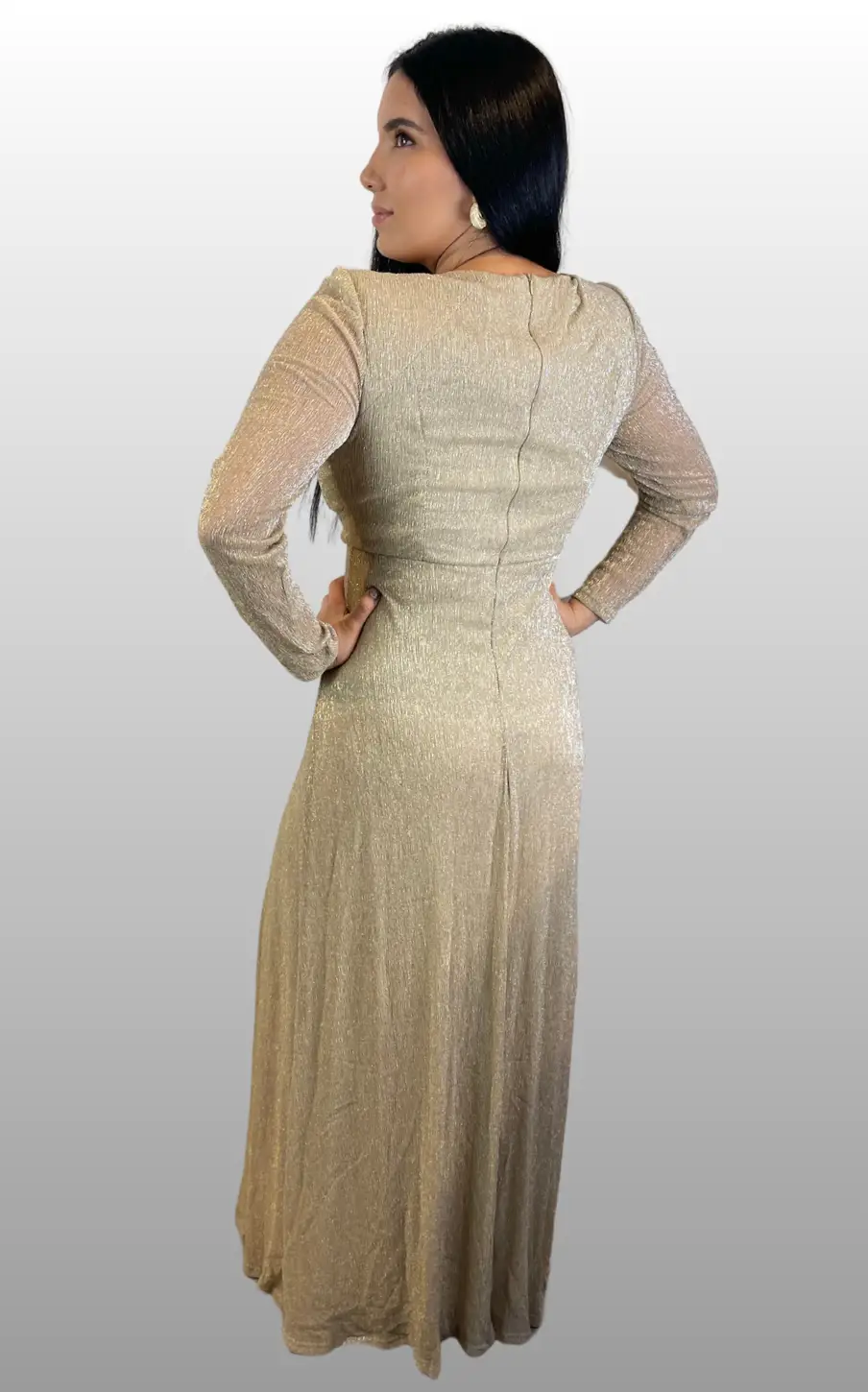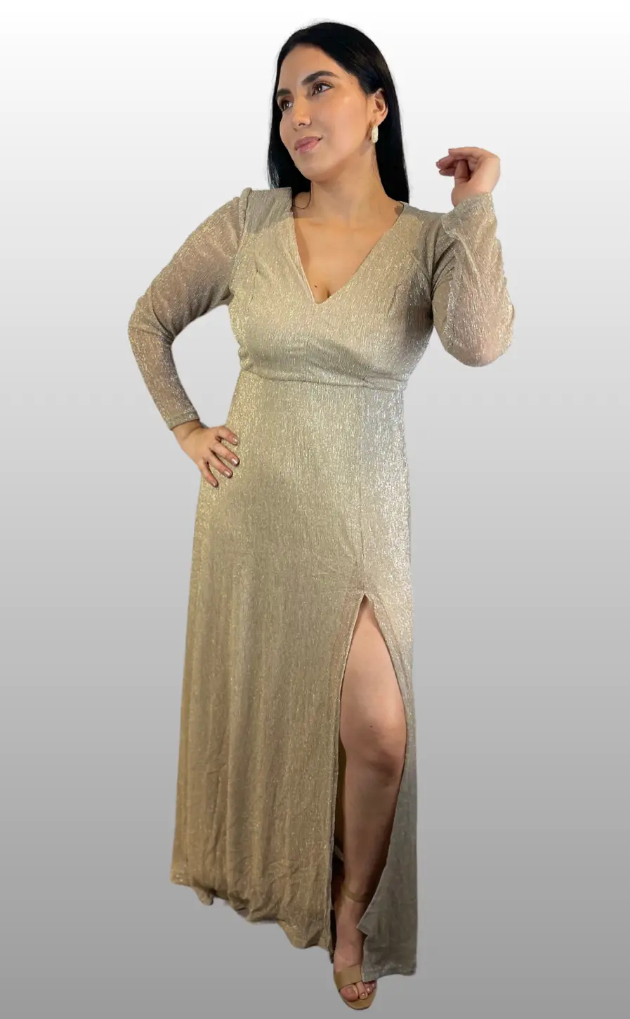 –Vestido de gala con abertura lateral, mangas largas y destellos brillantes.