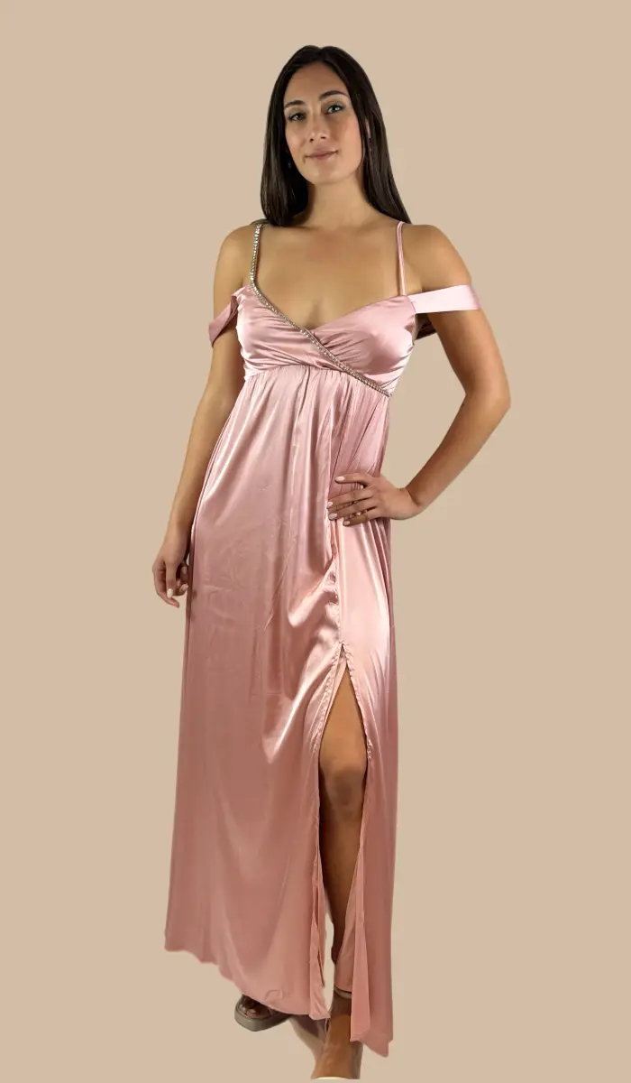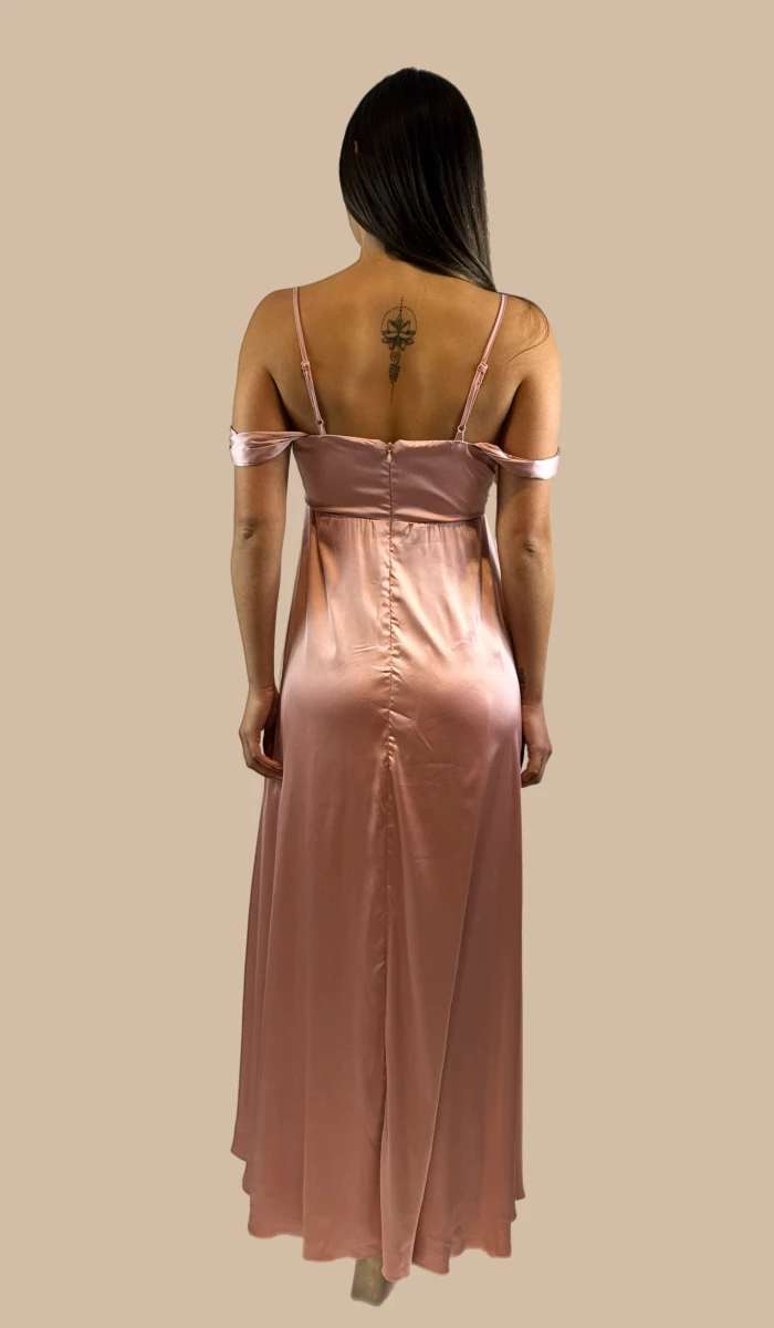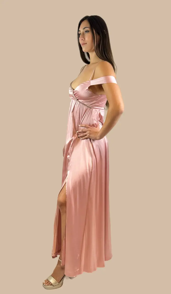 -Vestido de hombros descubiertos de muslo con abertura de satín