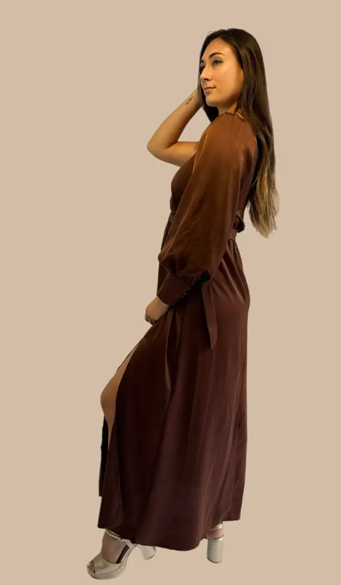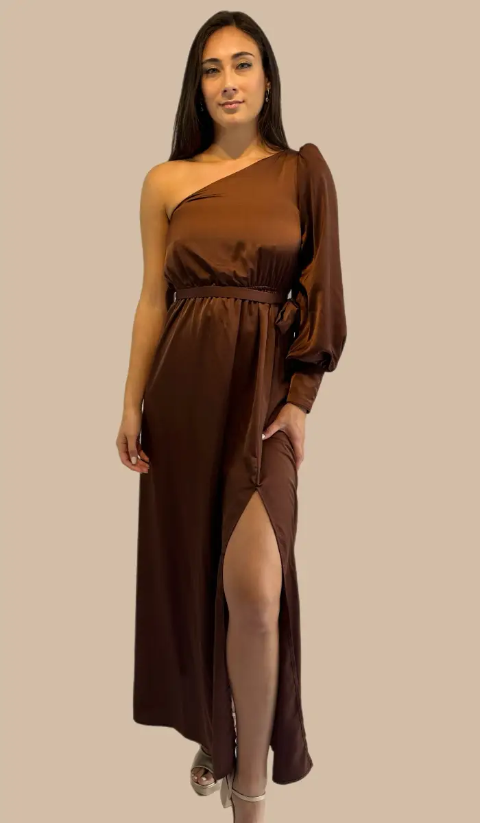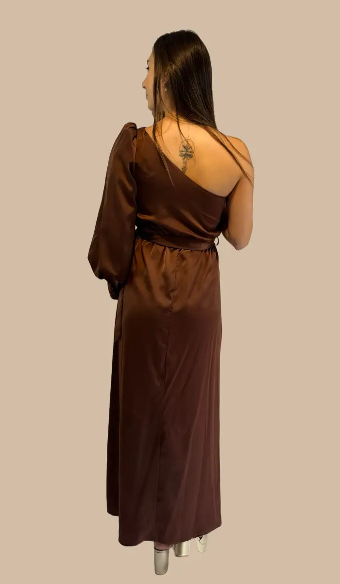 -Vestido satín un hombro café.