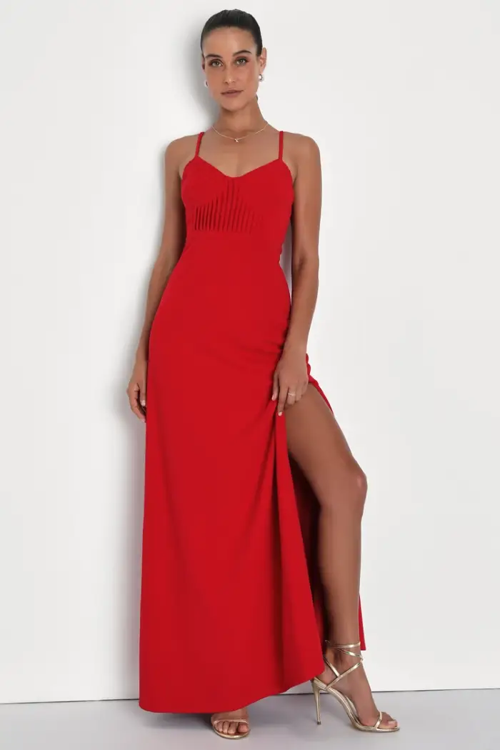 -Vestido largo rojo con corpiño sin mangas plisado
