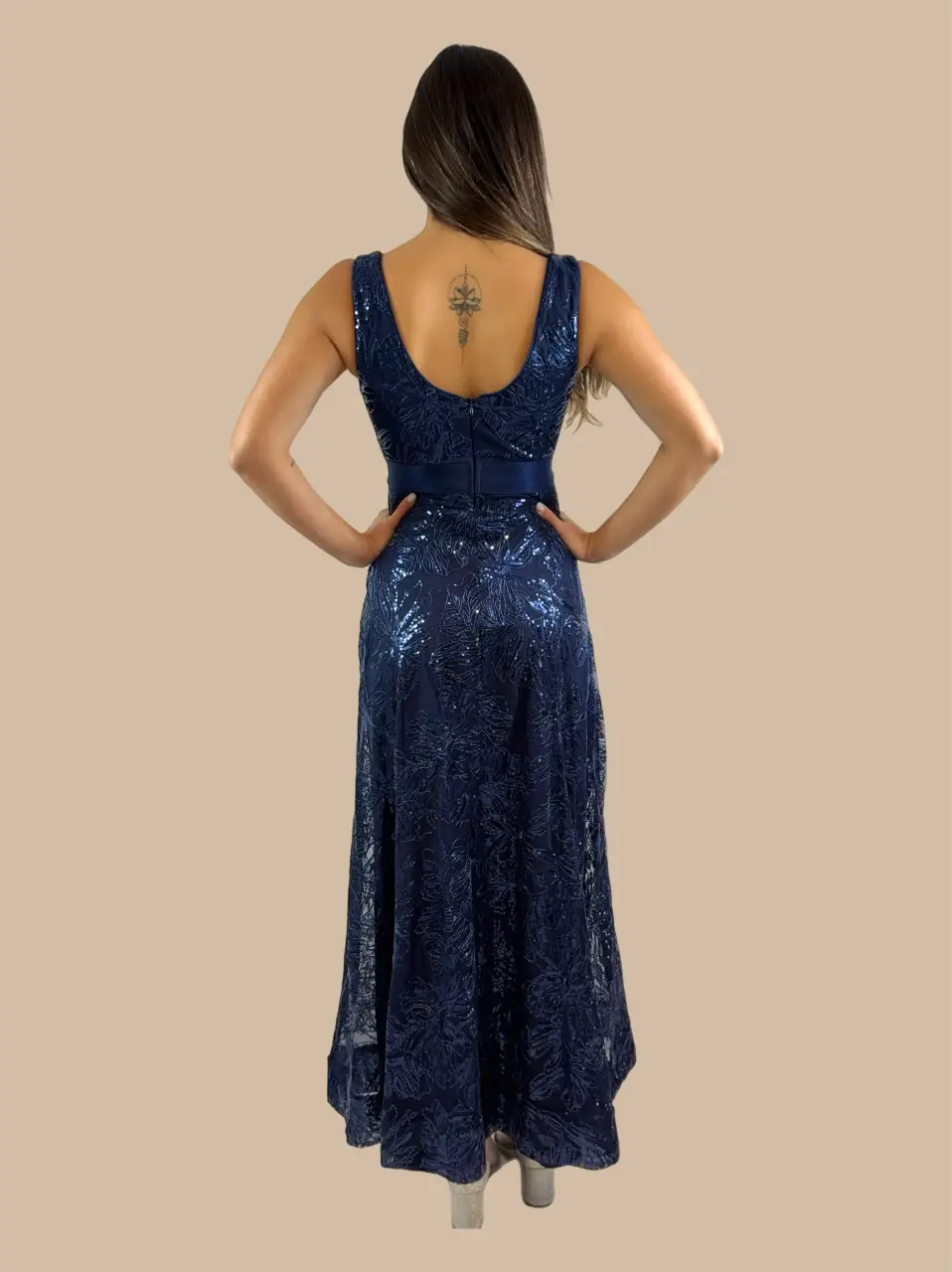 –Vestido formal con cuello en V ajustado, sin mangas, con bordado de lentejuelas.