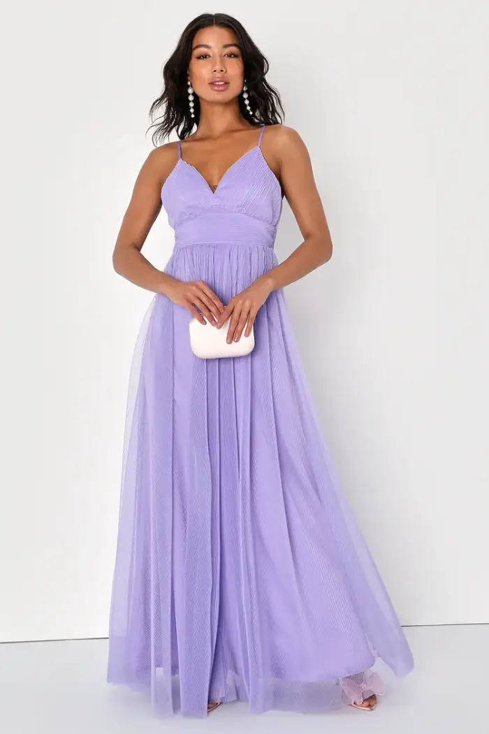 -Vestido largo de tul plisado en color lavanda